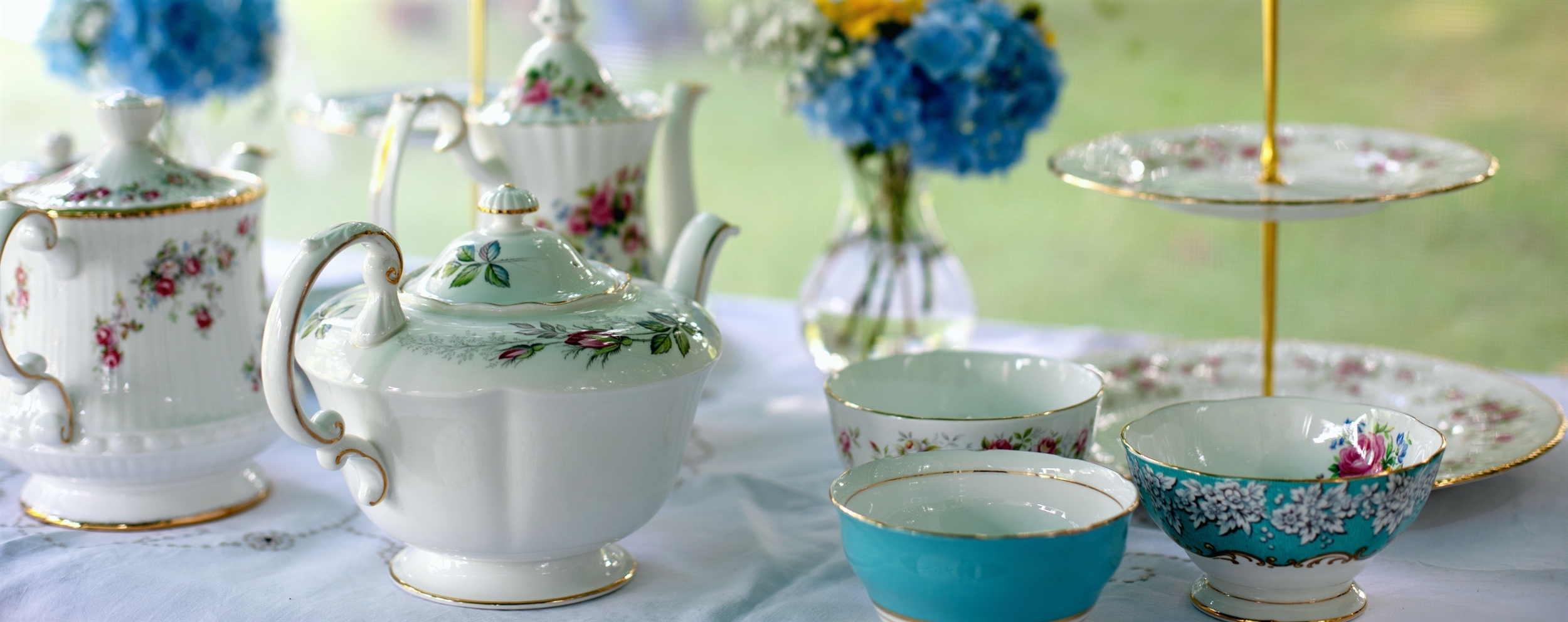 Our matching cup, saucer and tea plate trios come from a wide variety of beautiful English bone china designs. Three-tier cake stands, teapots and other pieces are carefully chosen to complement each other. Whether your event is a wedding, special anniversary, birthday, bridal or baby shower, we have just the right combination of china to bring to the party.